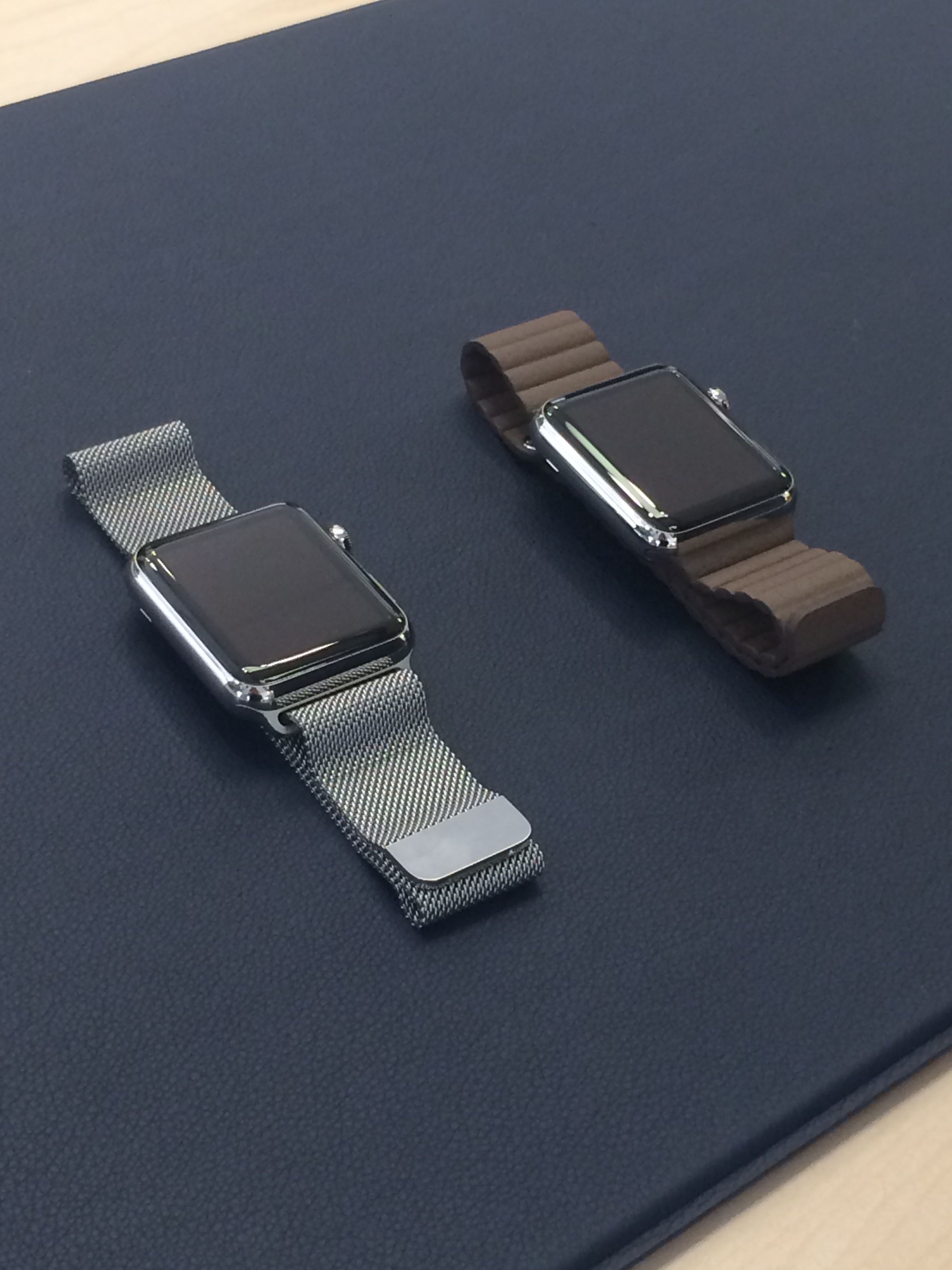 We tried on the Apple Watch Sport and the Stainless Steel Apple Watch with the Milanese loop band and the leather band.  The Apple store employee was only allowed to bring two watches out of his little drawer at the try-on table at a time.